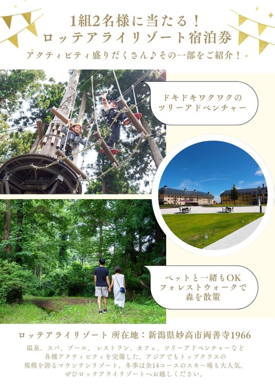 ロッテアライリゾート(新潟県妙高市)のデラックスツイン1泊1室2食+アドベンチャーパス付き宿泊券(有効期限:2025年12月19日まで)を1組2名様にプレゼント。