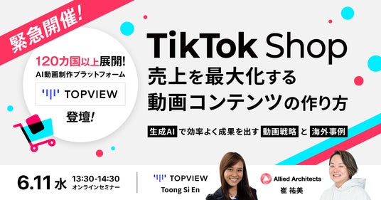 データとクリエイティブの力でマーケティングコミュケーションを設計し、企業のマーケティングAXを支援するアライドアーキテクツ株式会社(本社:東京都渋谷区、取締役社長:村岡弥真人、証券コード:6081、以下「当社」)は、TikTok Shop先進国シンガポールのAI動画制作プラットフォーム「Topview AI」と共催で、無料セミナー「TikTok Shopで売上を最大化する「売れる動画コンテンツ」のつくり方~生成AIで効率よく成果を出す動画戦略と海外事例~」を6月11日(水)に開催いたします。「Topview AI」社のマーケティング責任者をメインスピーカーに迎え、生成AIを活用した最先端の動画制作方法や海外で成果を出している「売れる動画」の共通点や事例を紹介いたします。