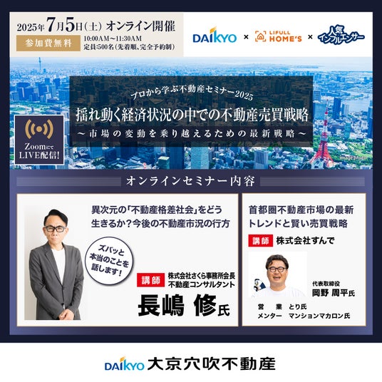 株式会社大京穴吹不動産(本社:東京都渋谷区)は、2025年7月5日(土)にオンラインにて「プロから学ぶ不動産セミナー 2025 揺れ動く経済状況の中での不動産売買戦略~市場の変動を乗り越えるための最新戦略~」を株式会社LIFULLと共同開催いたします。ゲストに株式会社さくら事務所 会長/不動産コンサルタントの長嶋 修氏、株式会社すんで 代表取締役 岡野 周平氏・営業 とり氏・メンター マンションマカロン氏を迎え、「今後の不動産市況の行方」についてや「首都圏不動産市場の最新トレンドと賢い売買戦略」について語っていただきます。オンライン開催で参加費無料、事前予約制です。