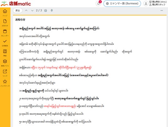 本部から配信された従業員向けの文書をAIで翻訳。ベトナム語、インドネシア語、ミャンマー語など、14ヶ国語に対応し、外国人スタッフの母国語で表示されることで、本部からの指示などに迅速に対応可能。
