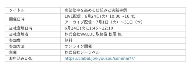 データと知見を核に、戦略から実行までマーケティングDXを一気通貫で支援する株式会社WACUL(本社:東京都千代田区、代表取締役社長:大淵 亮平、証券コード:4173、読み:ワカル、以下当社)は、6/24(火)に株式会社シーラベル(本社:神奈川県横浜市、代表取締役:渡辺敬吾、以下「シーラベル」)が主催するセミナー【商談化率を高める仕組みと実践事例】に登壇いたします。
