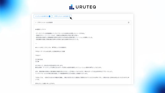 ログリー株式会社(本社:東京都渋谷区、代表取締役:吉永浩和、証券コード:6579、以下、ログリー)が提供するアカウントインテリジェンスツール※1「ウルテク ( https://uruteq.logly.co.jp/)」は、本日2025年6月12日(木)より、サイト訪問企業のインテント(興味・関心)を解析し、ワンクリックで営業メールを自動生成する新機能 「ウルテク インテントAIメール」 の提供を開始しました。本機能により、メール作成工数を大幅に削減しながら、最適なメール送付ができ、開封率や商談化率向上を実現します。