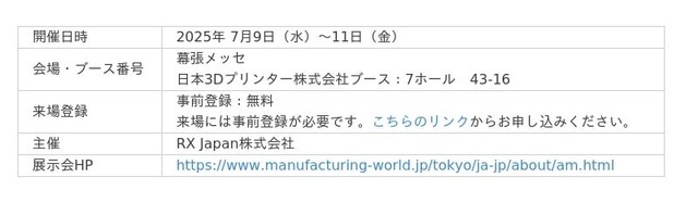 企業・教育機関向けに3Dデジタルソリューションを提供する日本3Dプリンター株式会社(本社:東京都中央区、代表取締役:北川 士博)は、幕張メッセにて2025/7/9(水)~7/11(金) の3日間開催される展示会【第8回 次世代3Dプリンタ展 東京】に出展し、本邦初公開製品含む、3Dプリンター/3Dスキャナーの各種新製品を展示いたします。