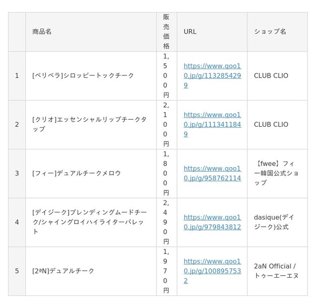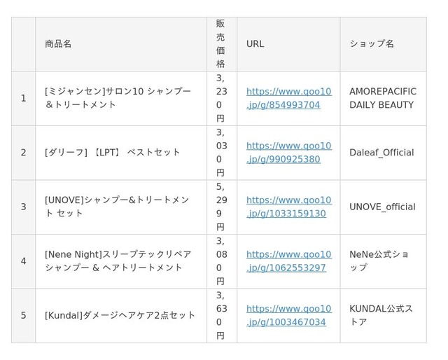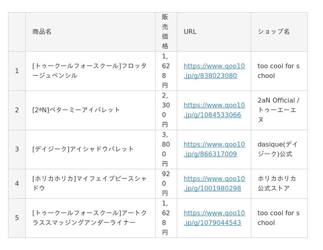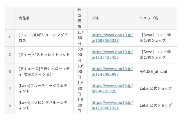 Qoo10(https://www.qoo10.jp/)サイト上、「シャンプー」「リップメイク」「アイシャドウ」「チーク」カテゴリーの公式ショップ各販売個数に基づいたランキングです。