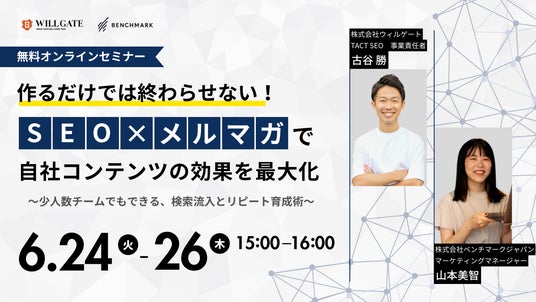 株式会社ウィルゲート(本社:東京都港区、代表取締役:小島 梨揮、以下 ウィルゲート)は、株式会社ベンチマークジャパン(本社:東京都千代田区、代表取締役:林 良亮)と共同で、無料オンラインセミナー『SEO×メルマガで自社コンテンツの効果を最大化~少人数チームでもできる、検索流入とリピート育成術~』を6月24日(火)15時より開催いたします。(申込み先:https://jp.benchmarkemail.com/seo-email-seminar-202506 )