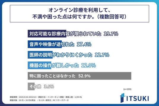 次に、オンライン診療を利用したことがある人を対象に「オンライン診療を利用して、不満や困った点」を尋ねる設問への回答では、1位が「特に困ったことはなかった」で52.9%、2位が「対応可能な診療内容が限られていた」で19.7%、3位が「音声や映像が途切れた」で17.4%という結果になりました。この結果から、オンライン診療を利用したことがある人の半数以上が、特に困ったことはなかった一方で、「対応可能な診療内容が限られていたこと」や「音声や映像が途切れたこと」に不満を持ったり、困ったと感じた人もいることがわかりました。