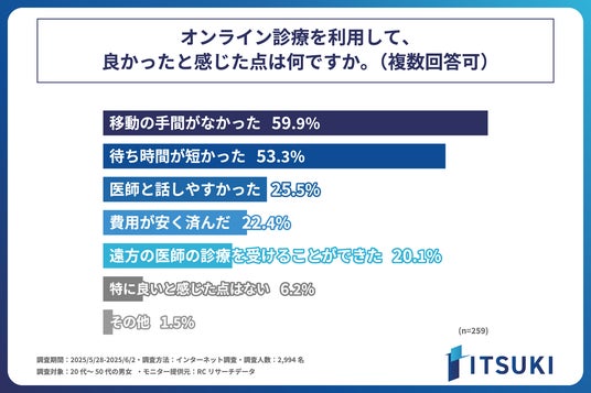また、これまでにオンライン診療を利用したことがある人を対象に「オンライン診療を利用して、良かったと感じた点」を尋ねる設問への回答では、1位が「移動の手間がなかった」で59.9%、2位が「待ち時間が短かった」で53.3%、3位が「医師と話しやすかった」で25.5%という結果になりました。この結果から、オンライン診療を利用して主に良かったと感じたことは、「移動の手間がなかったこと」や「待ち時間が短かったこと」であることが明らかになりました。