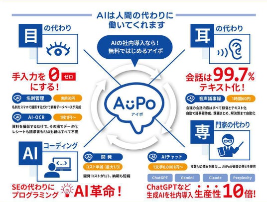 「AiiPo」は、最新AI技術を駆使したWEBとスマートフォンのハイブリッドアプリで、ビジネスのあらゆる側面をサポートします。- 名刺管理と顧客マスタ化: スマートフォンで名刺を撮影するだけで、AI-OCRが顧客データを自動抽出し、顧客マスタとして一元管理します。リリース記念として、SaaSサービスとして有名なSANSANと同様の機能を期間限定で無料提供しております。