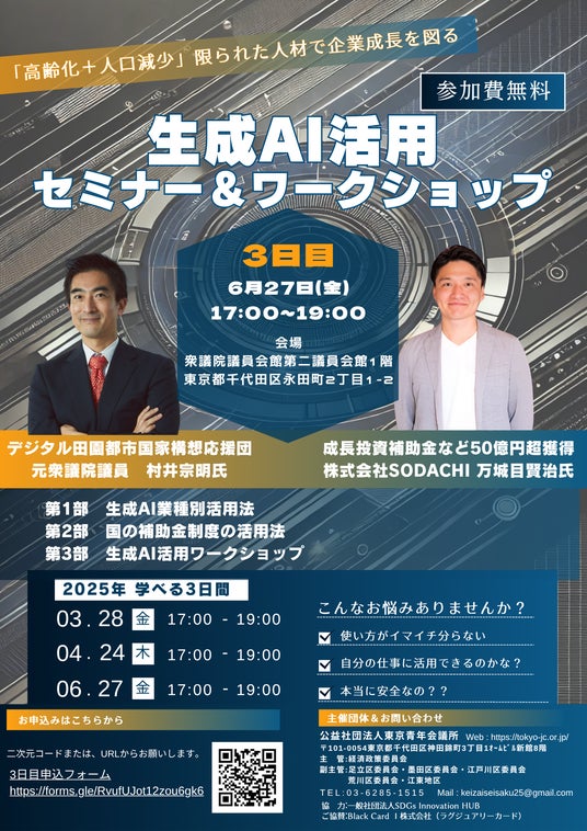 公益社団法人東京青年会議所(以下「東京青年会議所」)は、高齢化や人口減少といった社会課題に対応し、限られた人材で企業成長を図ることをテーマに、「生成AI活用セミナー&ワークショップ」の第3回目を2025年6月27日(金)に開催いたします。