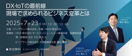「DX・IoTの最前線。現場で求められるビジネス変革とは」をテーマに、NSW株式会社 サービスソリューション事業本部 営業統括部 第一営業部 主任 大石竜丸氏と、ビープラッツ株式会社 代表取締役社長 藤田健治の講演を行います。
