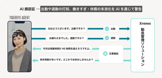 さらに今後は、TIGEREYEが手掛けるAIアバターとの連携により、本人認証に加え、AIとの会話を通じて出退勤の打刻や業務状況の把握、注意喚起などを行える勤怠管理機能のリリースも予定しています。