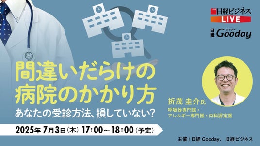 受講料:日経Goodayの有料会員(日経Goodayマイドクター会員)、日経ビジネス電子版の有料会員、雑誌「日経ビジネス」の購読者は無料で参加・視聴できます(事前登録制、先着順)。会員にならずにウェビナー視聴をご希望の方は、3300円(税込)で視聴可能です。