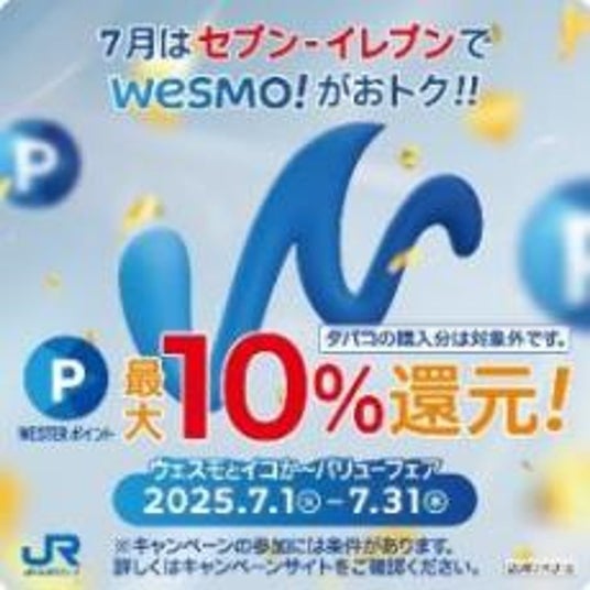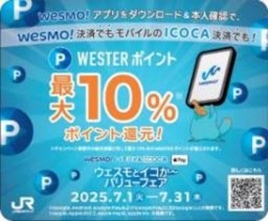 西日本旅客鉄道株式会社(本社:大阪府大阪市、代表取締役社長:倉坂昇治)は、2025年5月28日にリリースしましたJR西日本のスマホ決済アプリ『Wesmo!』のキャンペーンとしまして、Wesmo!やモバイルのICOCA(WESTER会員登録しているモバイルICOCA/Apple PayのICOCA。以下同)のご利用でWESTERポイント(基本)最大10%還元とおトクになる『ウェスモとイコか~バリューフェア』(通称:ウェスイコ)を2025年7月1日(火)~7月31日(木)まで開催します。