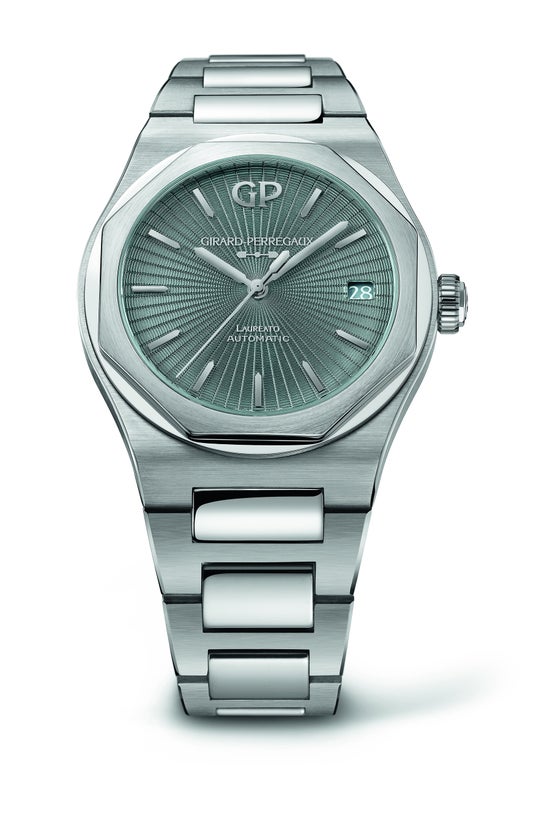 スリムなラインと一体型ブレスレットを特徴とするロレアートは、抜群の着け心地と時代に左右されないスタイルで知られています。ロジウムプレートのバトン型針で時と分を示し、細身のセンターセコンドには、ジラール・ペルゴの DNA をさり気なく讃えるアイコニックなゴールドブリッジにインスパイアされたカウンターウェイトを配しました。3時位置の日付窓はエレガントなデザインで、ダイヤルに合わせたカラーのディスクにホワイトの数字の組み合わせです。