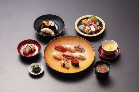 2階「金沢 鮨 松の下」は、7mを超える1枚板のカウンターを設えた四季折々を感じる空間で、日本三名園の兼六園を眺めながら、北陸の魚を中心に職人の手仕事が効いた本格的な鮨と銘酒を味わえる寿司店です。20種類以上のネタから選べる、たっぷりとお腹を満たす「60分食べ放題付きコース」をご用意しております。