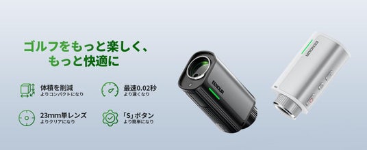 23mmの大口径レンズ、7倍望遠機能、そして最速0.02秒の高速測定を搭載し、ピンロックや3点間距離測定など多彩なモードにも対応。ゴルファーにとって、よりスピーディーかつ正確で快適なプレーをサポートする一台です。