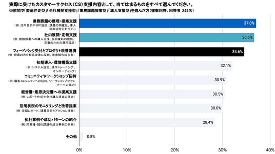 また、実際に受けた支援内容としては、「業務課題の整理」や「全社展開支援」「経営層への提案」などが多く挙がり、戦略・実行・定着のすべてを支える多面的な役割がカスタマーサクセスに求められています。