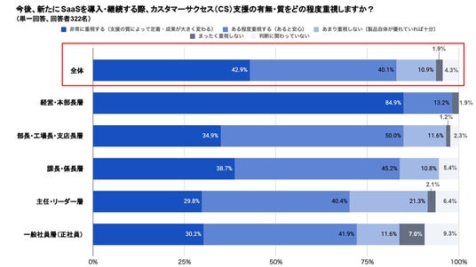 ● カスタマーサクセス支援の有無・質はSaaS導入時の意思決定において「非常に重視」されていることが明らかになりました。経営層・本部長層では84.9%が支持しています。