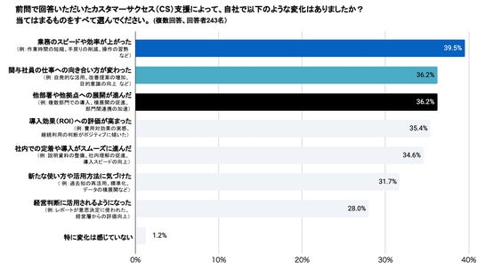- 「特に変化を感じていない」はわずか1.2%で、カスタマーサクセス支援の有効性がほぼ全回答者に実感されています。