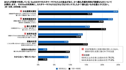 ● SaaS導入・活用時におけるカスタマーサクセスのスタンスは、企業規模を問わず7割以上が「能動的な支援」と回答。特に大企業では「全社展開支援型」が25.0%と高く、全社的な導入を牽引する存在として期待されています。