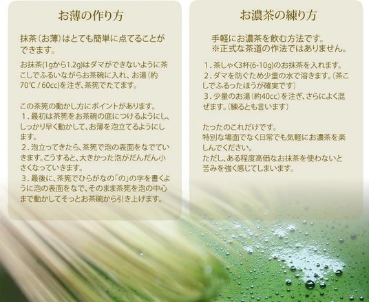 茶葉に含まれている成分には水に溶け出す水溶性の成分と、水に溶けない脂溶性の成分があります。普段飲んでいるお茶の浸出液には水に溶け出す成分だけが含まれていますが、抹茶の場合は茶葉そのものを飲むことになりますので、すべての成分が摂取できます。