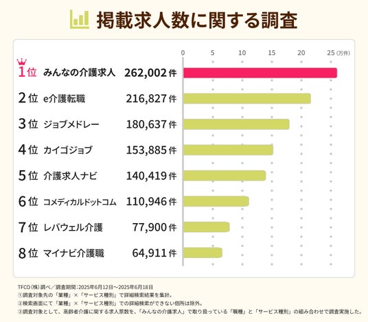 この度のNo.1獲得は、第三者機関であるTFCO株式会社による調査結果に基づいています。本調査は、2025年6月12日~2025年6月18日 にかけて、全国の主要な介護専門転職サイトを対象に集計・分析されたものです。調査手法としては、ネット検索によるデスクリサーチ調査で行われています。