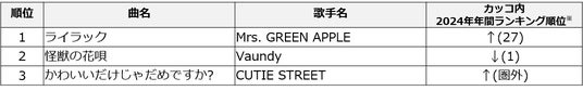 2024年年間ランキング31位以下の曲は「圏外」と表記しています。