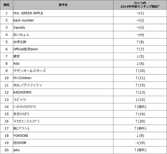 ※ 2024年年間ランキング21位以下の歌手は「圏外」と表記しています。