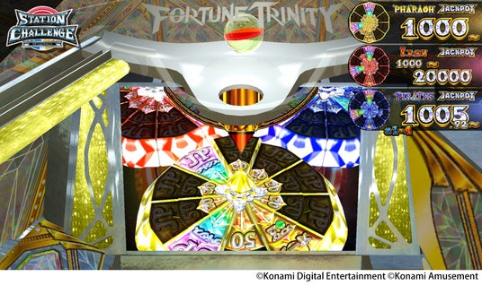 最大20人で遊ぶことができ、趣向のことなる3種のJACKPOT抽選ゲームと、中央に取りつけられた直径3mの超大型天井ルーレットが特徴です。JACKPOTを獲得すると、光と音と映像がリンクしながらメダルを払い出す「フォーチュントリニティ」シリーズだけの特別な体験を提供します。