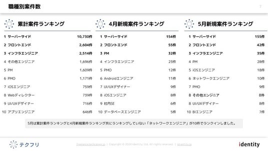 4月度と比較した5月度のデータや、テクフリ全体のデータなど、より詳細なレポートは下記URLよりダウンロードいただけます。案件の市況感を知りたい方や、キャリアアップのために情報収集をしたい方は、ぜひダウンロードくださいませ。