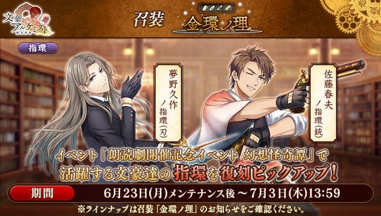 召装『金環ノ理』のラインナップを更新いたしました。この召装では、イベント『朗読劇開催記念イベント「幻想怪奇譚」』で活躍する「佐藤春夫」「夢野久作」の指環を一定の確率で入手できます。