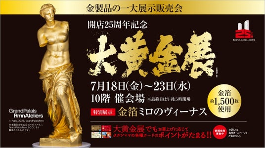 実物資産として「金」の価値が注目される中、ジェイアール名古屋タカシマヤでは、金の工芸品を取り揃える「大黄金展」を初開催いたします。世界的に有名な「ミロのヴィーナス」を忠実に再現した金箔像や、昭和改元から100年を記念して造られた7億円超の大判、名古屋名物スウィーツ「ぴよりん」をモチーフにした純金ぴよりん小判など話題性抜群の特別品のほか、大小様々な縁起物や仏具、食器、ネックレスなど1,000点以上の金製品を展示・販売します。また会場では、ご自宅に眠っている貴金属(金・銀・プラチナ製品)の買取り・査定も行います。