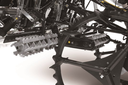 「YR-Cシリーズ」は、機体を降りた状態で微速前進・停止の操作が行えるレバーを搭載し、ほ場の出入りやあぜ越え、トラックへの積み下ろしも安心して操作ができます。「微速前進レバー」を握ると、微速で前進、離すと停止します。「CSレバー」を握ると、機体から降りたまま簡単にブレーキをかけることができます。また、「フロントハンドル」で、ほ場の出入りやあぜ越えでの機体の前上がりを抑えられます。万が一の時には、「エンジン停止スイッチ」を押すだけでエンジンを停止できます。