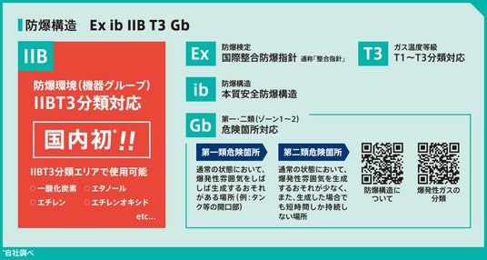石油精製・石油化学・化学プラントなど、常に可燃性ガス(爆発性ガス)が発生しているまたは発生する恐れのある場所で、機器そのものが発火元となって爆発事故を起こさないように作られた機器です。