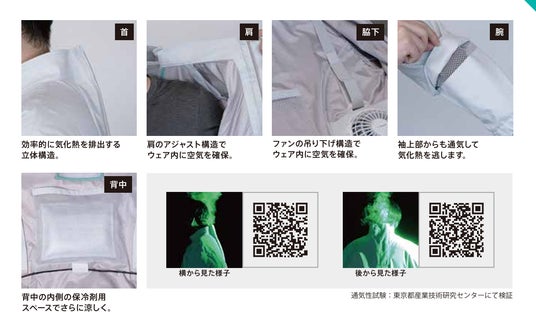肩や背中周りの立体構造は当社独自。効率的に気化熱を排出し、ウェア内に涼しい空気を確保できる構造です。