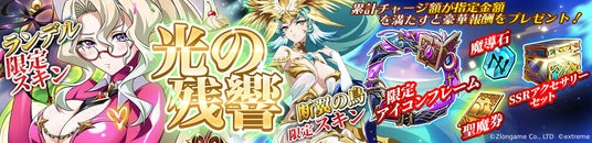 『光の残響』は累計チャージ額が指定金額に達すると、そのチャージ額に応じた報酬を獲得できる期間限定イベントです。限定アイコンフレームや聖魔券、魔導石、SSRアクセサリーセットなど、豪華報酬を獲得することができます。