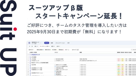 株式会社スーツ(所在地:東京都千代田区、代表取締役社長CEO:小松 裕介)は、ご好評につき、チームのタスク管理・プロジェクト管理ツール「スーツアップ」のβ版スタートキャンペーンを2025年9月30日まで延長いたします。