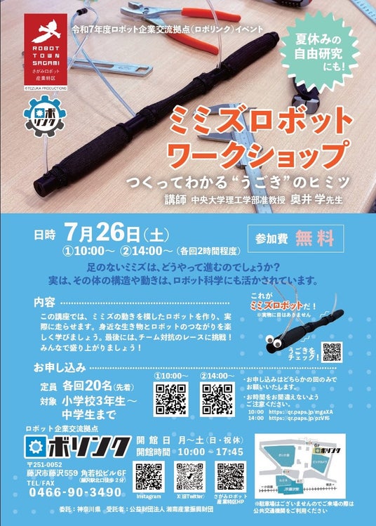 藤沢駅近隣のロボット企業交流拠点「ロボリンク」で、身の回りの様々な所で使用されている「ミミズロボット」を使った工作体験イベントを開催します。