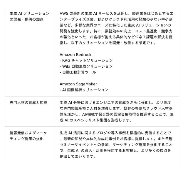 アイレットは、これらの実績を活かし、生成 AI 活用における多様な課題に向き合う国内企業への生成 AI の導入から活用、そして包括的な企業 DX の推進をさらに強力に支援することを目的に、AWS と本戦略的協業契約を締結します。また AWS との連携を強化することで、規模や業種を問わず幅広いお客様の企業価値向上を支援していきます。なお、本契約を通じて、アイレットは、以下の取り組みを強化していきます。