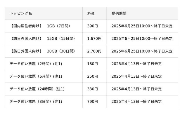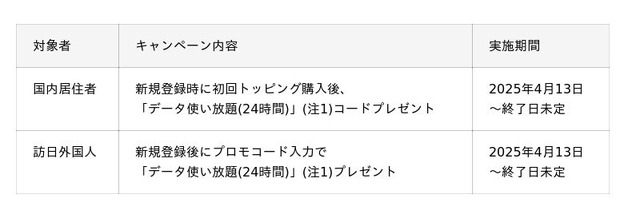 国内居住者向けには、初回限定トッピングとして「1GB(7日間)」の提供を開始します。