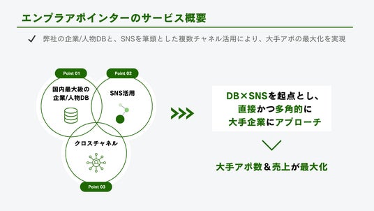 エンプラアポインターは、大手企業・決裁者アプローチに特化した営業支援サービスです。従来のテレアポでは平均接触率が1割に満たない現状に対し、LinkedInなどのSNSを活用したマルチチャネルアプローチで、企業のキーマン層へ直接アプローチが可能。これにより、ニーズが顕在化している企業において、CxOや事業責任者など「商談化につながる層」へのアポイント獲得を支援します。導入ハードルが高いとされる大企業への新規開拓も、ノウハウ不足・営業リソース不足といった障壁を乗り越えながら、質と効率を両立したアプローチが可能になるため、ローンチからわずか4ヶ月で20社の導入社数を突破し、受注率を高める営業チャネルとして注目を集めています。
