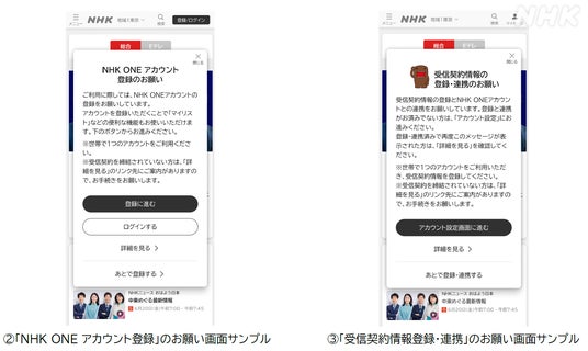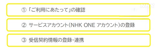 インターネット上で受信契約の確認をさせていただくため、受信契約情報の登録と、2.で登録いただいたNHK ONE アカウントとの連携をお願いいたします。その後、NHKにおいて契約照合を行います。