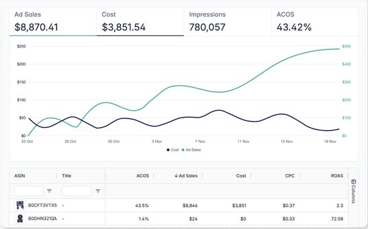 シンプルなダッシュボード設計により、広告の成否を判断するために必要な情報が簡潔に示され、アカウント全体およびASIN別の詳細なパフォーマンスを一目で確認できます。