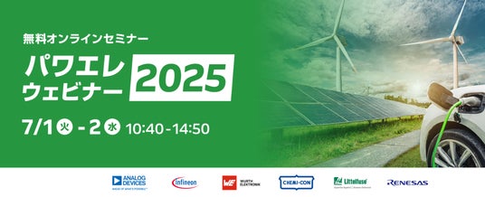 「パワエレウェビナー2025」では、SiCパワーデバイスなどのパワー半導体からコンデンサなどの受動部品まで、パワーエレクトロニクスに関する最新情報を半導体メーカー、電子部品メーカー各社よりお届けします。