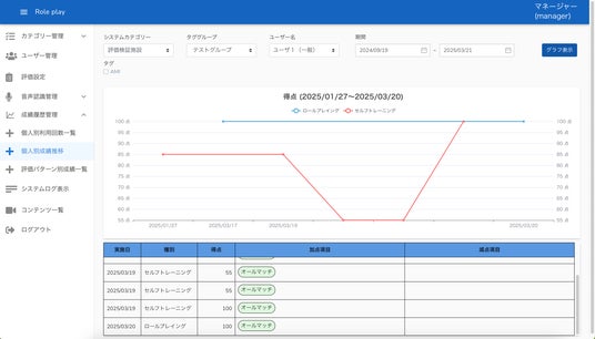 セルフトレーニングの「個人別利用回数」「個人別成績推移」「評価パターン別成績」を、それぞれ一覧表示できるようになりました。1人ひとりの学習状況や、コンテンツに対する組織全体の習熟度をグラフで把握し、効率的に学習管理を行うことが可能です。