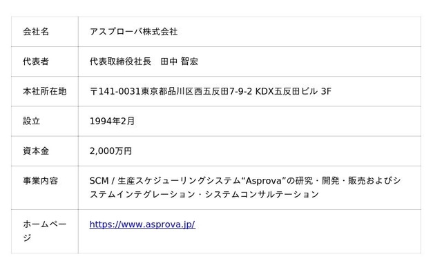 Asprovaは、1994年にアスプローバ社が開発した生産スケジューラです。多品種多工程の生産計画を超高速に作成し、工場の各設備や人員のスケジュールを秒単位の精度で作成し、実行可能な作業指示を計算してガントチャートで出力します。発売以来、国内外の幅広い製造業で採用され、順調に導入・利用社数を拡大しています。今後も生産スケジューリングのデジタライゼーションを支えるプラットフォームとして、機能とサービスの拡充を図ってまいります。(https://www.asprova.jp/products/overview.html)