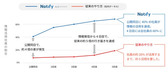 導入前は約20%の社員が情報を活用するまで計5日間も要したものの、Notify によって情報の到達率が改善され、公開初日に社員の約40%が情報を活用し、4日目には社員全体の約60%に達した、といった効果が算出されています。