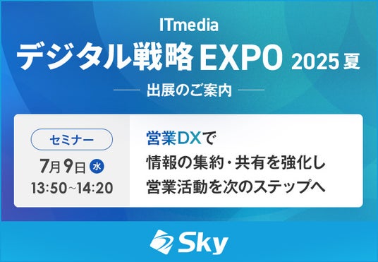 Sky株式会社は、2025年7月9日(水)~8月6日(水)に開催される、ITmedia主催のオンライン展示会「ITmedia デジタル戦略EXPO 2025 夏」に出展いたします。