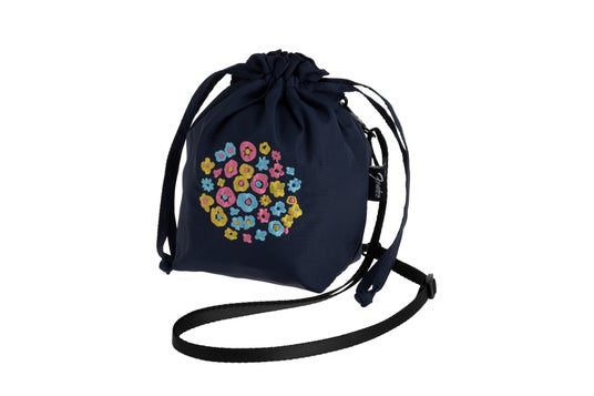 「Blue Flower」のパターンが刺繍された、日常使いからコンサートやロックフェスでの使用まで、さまざまなシーンで活躍するストラップ付きの巾着バッグです。底マチがあるため、スマートフォンや財布のほか、日常で使う小物がたっぷりと収納できるサイズ感となっています。収納部には12cm四方の内ポケットがあり、15cm高さのスマートフォンが絞り口に当たることなく収納が可能。ネイビーの生地には軽量で質感のよいナイロンを使用しています。ブランドタグには、過去アコースティックギターに使用された古いタイプのフェンダーロゴを採用しており、ヴィンテージフィール溢れるアイテムに仕上がっています。