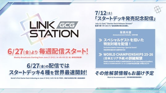 「GUNDAM CARD GAME -Link Station-」は6月27日(金)より毎週配信がスタートし、7月12日(土)のスタートデッキ発売日には「スタートデッキ発売記念配信」として、スペシャルゲストを招いた特別対戦や、『ガンダムカードゲーム』の世界一を決める大会「WORLD CHAMPIONSHIPS 25-26」日本エリア予選の詳細を解禁いたします。こちらの配信番組もぜひご覧ください。